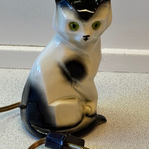 34/1 . Rigtig fin ozon lampe i porcelæn af kat med fatning og pærer sælges for 250,00 kr. Den er 21 cm høj, 15,5 cm bred og 11 cm dyb. Fremstår hel og fin uden afslag. Kan sende med DAO og GLS.