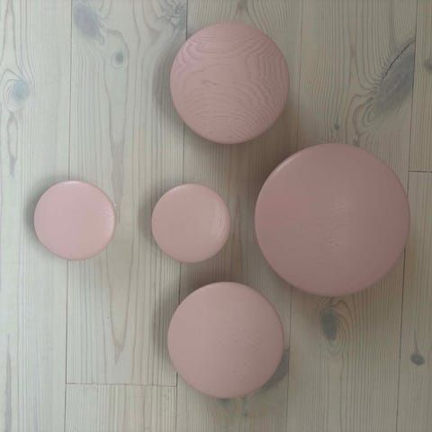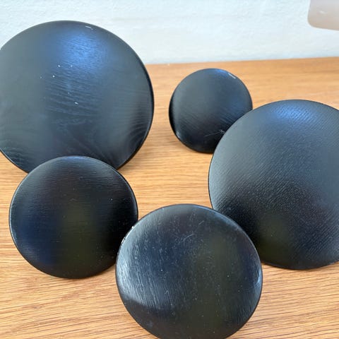 Muuto knager i rundt design i hvid og grå. Sættet består af flere vægknager i forskellige størrelser, som kan bruges til ophæng af tøj, tasker eller til dekorativ opbevaring i entré, soveværelse eller andre rum i hjemmet. Overfladen fremstår glat på de hvide knager og med struktureret finish på den grå knage.
