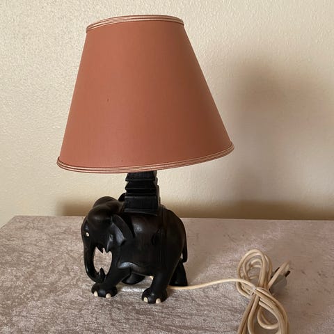 Bordlampe udformet som en elefant i mørkt træ med brun lampeskærm. Lampen har udskåret elefantfod som fod og en opbygget søjle til fatningen. Ledning med stik er monteret. Velegnet som dekorativ belysning på bord, kommode eller natbord.
