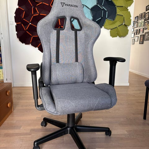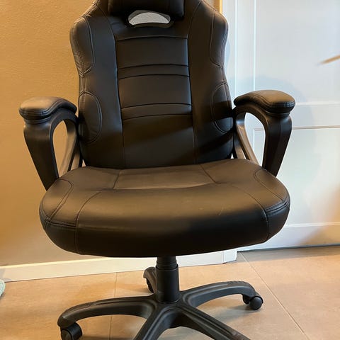 Arozzi gamingstol i sort kunstlæder. Stolen har høj ryg med integreret nakkepude og udskæringer øverst i ryggen. Sædet er polstret og formet med sider til støtte. Armlænene er justerbare i højden. Stolen har vippe- og lænefunktion, så ryggen kan lægges langt tilbage. Femstjernet fod med hjul for nem flytning. Betrækket på sædet viser tydelig slitage, som ses på billederne. Selvom der er slidtage sidder man stadig fantastisk i den, man kan evt købe en lændepude eller anden pude til at sidde med bedst mulig støtte.