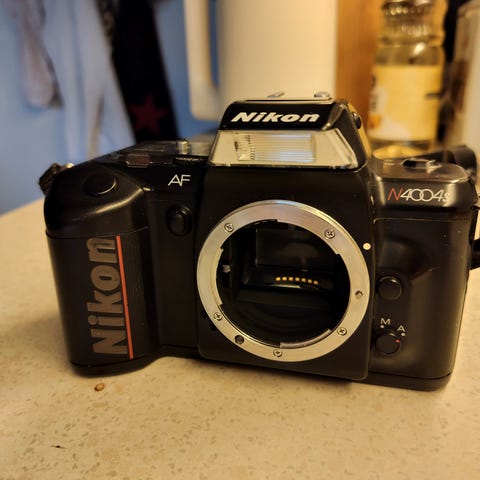 Objektivet er et godt allround AF Nikkor 35-105mm 1:3.5-4.5 (dækker fra vidvinkel til let tele)i samme perfekte stand.
