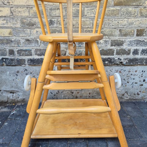 Vintage højstol i træ fra 1960erne Stolen har rund ryglæn og integreret bordplade, som kan vippes ned, så stolen kan bruges både som højstol og som lav stol med bord. Der er fodstøtte og lille legebord med påmonterede trækugler. Egnet til små børn, når de skal sidde ved bordet eller have en fast siddeplads til leg og spisning.
