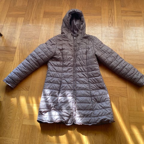 Damejakke i str. 38 i brun farve. Jakken er let vatteret med vandret quiltet mønster og har fast hætte. Den lukkes med lynlås foran og har sidelommer med lynlås. Modellen er knælang og egner sig som overgangs- eller let vinterjakke til hverdagsbrug.