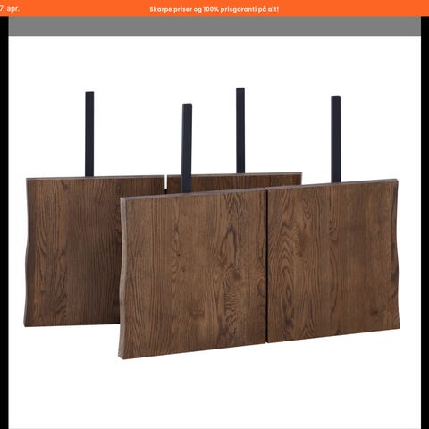 Tillægsplader til plankeborde Årsag til outlet: Brudt emballage Har du brug for et større spisebord og vil du gerne have mulighed for mere plads rundt omkring det?Så kan du tilkøbe matchende tillægsplader og forlænge dit Susan, Molly og Esther spisebord med i alt 100 cm - dvs. 50 cm i hver ende.Pladerne sælges i et sæt af 2 stk. og er naturligvis lavet i det samme flotte planker som vores borde. OBS - Åretegningerne på tillægspladerne følger ikke retningen på bordene.