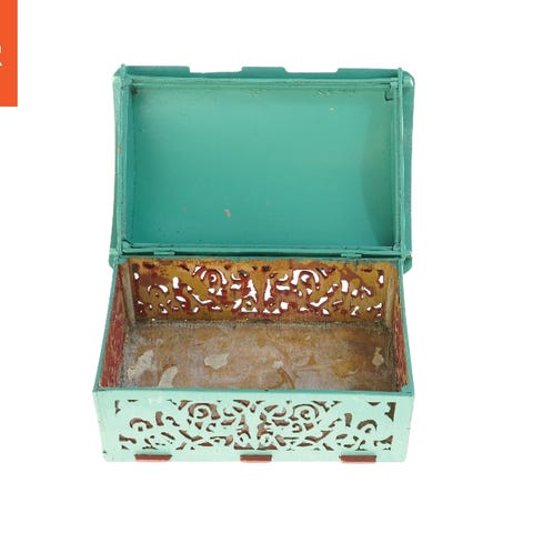 En rektangulær kasse lavet af træ med mål på 34x14 cm. Den har et dekoreret ydre med indgraverede og håndmalede blomster. Almuekunst. Kassen er tom indeni, hvilket gør den velegnet til opbevaring eller som dekoration.