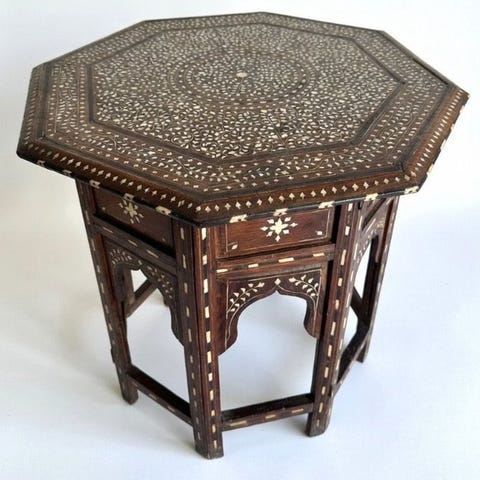 Håndskåret træbord i lille størrelse fra Indien, dateret 1980–1990, i god brugt stand med mindre aldersmærker og pletter; mål cirka 390 × 375 × 375 mm. Klik på den blå "gå til varen" knap, for at købe eller byde på denne vare. Den samlede pris vil blive vist inden du afgiver dit bud.