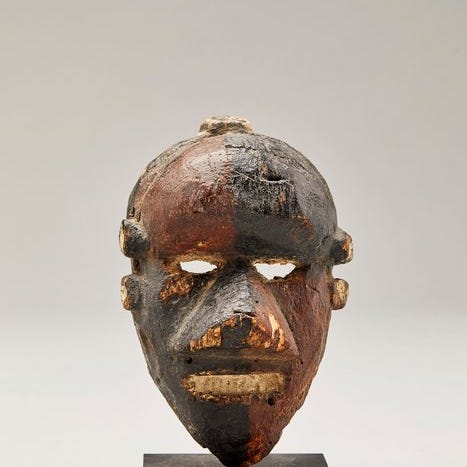 En maske oprindeligt fra Gabon tilhører Galos-stammen. Disse masker, kendt som de hvide masker, blev traditionelt brugt af dansere på stiger i begravelsesceremonier.