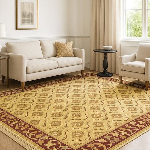 Et tæppe fra Indien, håndknudret med fine uldfibre. Til dets fremstilling blev den tibetanske teknik anvendt i knudningen over bomuldsvæv og bomuldstråd.
