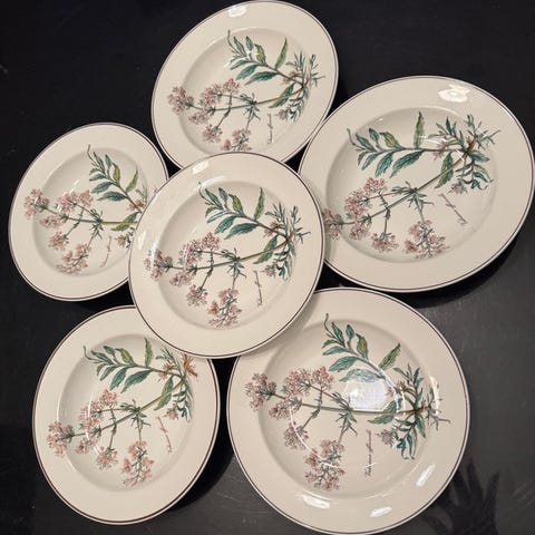 Sæt af seks tallerkener i fin keramik fra Churchill-fabrikken, med elegant frugtdesign, der forestiller ribsbær og stiliserede blade.