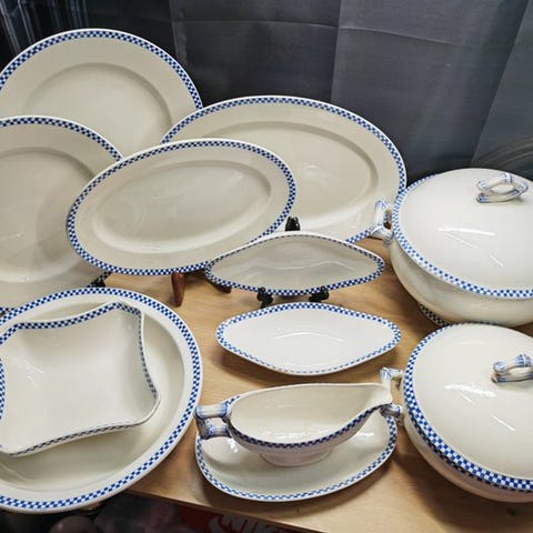 Elegant bordservice i fajanse fra Longchamp-fabrikken, genkendeligt på det fine sort-rutede mønster på elfenbensfarvet baggrund.