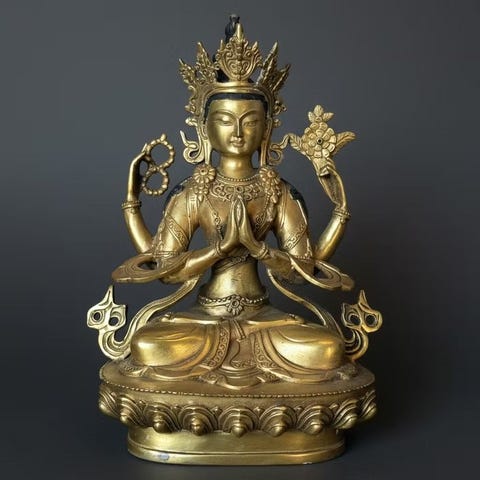 Han sidder ofte eller står på en lotusblomst. Den blomstrende lotus symboliserer kampen for at undslippe lidelsernes forurening