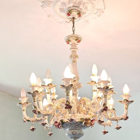 Pragtfuld femarmet lysekrone: helt håndlavet af en mester glasmager i Murano, en ægte klassiker inden for Murano-glas. Med smuk lysstyrke under forskellige lysforhold; se alle billederne. Den oplyste en lille sal i et hotel i Venedig, som nu er under restaurering. Den tidligere ejer husker, at de blev købt hos den berømte Fornace Pauly i Murano, men på grund af tidsperioden er købsdokumenterne ikke bevaret.