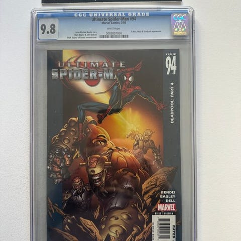 Ultimate Spider-Man, første udgave, graded tegneserie, CGC 9.8 med Carnage-optræden som homage til Amazing Spider-Man #100, Marvel Comics, engelsk, 2006, nr. 100 – variantomslag, mint tilstand, hæftet bindning, kunstnere Drew Hennessy, Mark Bagley, John Dell og Brian Michael Bendis. Klik på den blå "gå til varen" knap, for at købe eller byde på denne vare. Den samlede pris vil blive vist inden du afgiver dit bud.