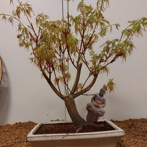 Smuk Acer palmatum deshojo bonsai. Om foråret stråler den med sine dybt røde blade, som hen imod sommeren ændrer sig til en dyb grøn farve. Et særligt farverigt lille træ!