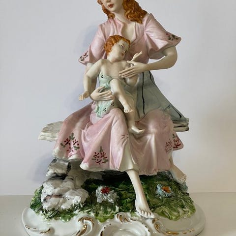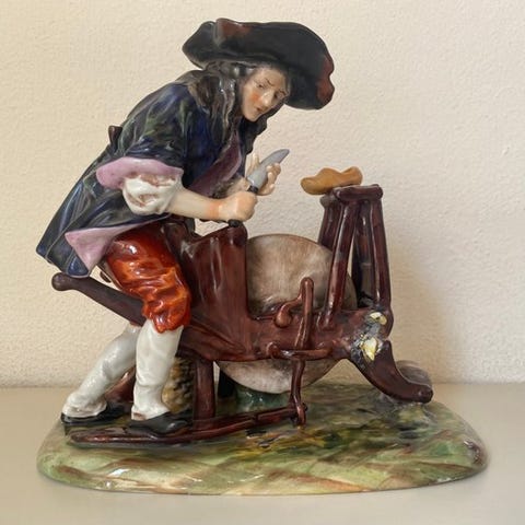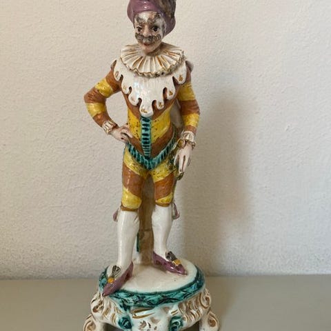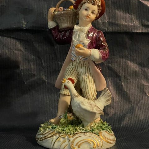 Capodimonte flerfarvet porcelænsfigur af en stolpegler med titel "Impagliatore di sedie", fra 1930–1940 i antik stil, højde 20 cm, bredde 11 cm, dybde 12 cm, vægt 560 g, i meget god stand med sjælden brug og kun lette slid- og aldersmærker samt en lille affladning på hatten. Klik på den blå "gå til varen" knap, for at købe eller byde på denne vare. Den samlede pris vil blive vist inden du afgiver dit bud.