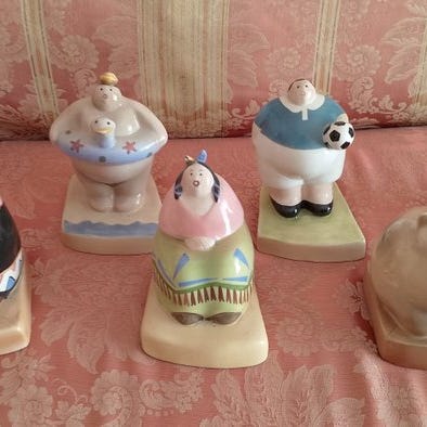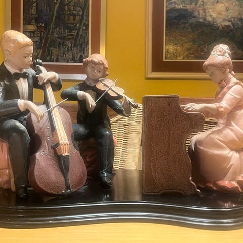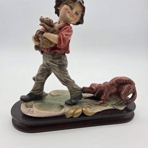 Håndlavet keramisk statue produceret af Sibania porcellana Vicentina, til samlingen, forestiller en dreng siddende på en rød vespa, der spiller en stor guitar. Den er i god stand og har to små fejl; alt dette ses på billederne, som udgør en integreret del af beskrivelsen og viser genstandens faktiske tilstand.