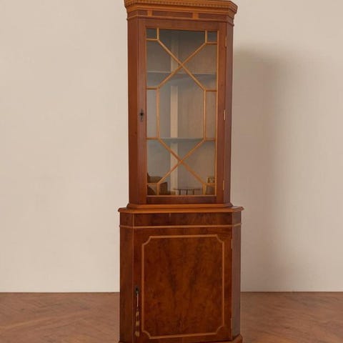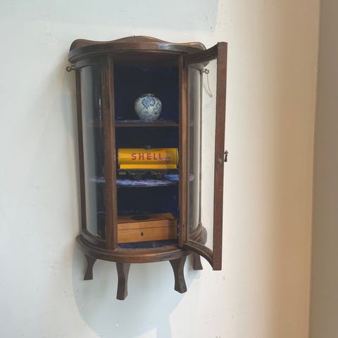 Vitrineskab i massivt egetræ fra Nederlandene, ca. 1930–1940, måler 58 × 53 × 16 cm, med nøgle, hylder med udskæringer til tallerkener og lås der fungerer, i god brugstilstand med mindre aldersrelaterede mærker. Klik på den blå "gå til varen" knap, for at købe eller byde på denne vare. Den samlede pris vil blive vist inden du afgiver dit bud.