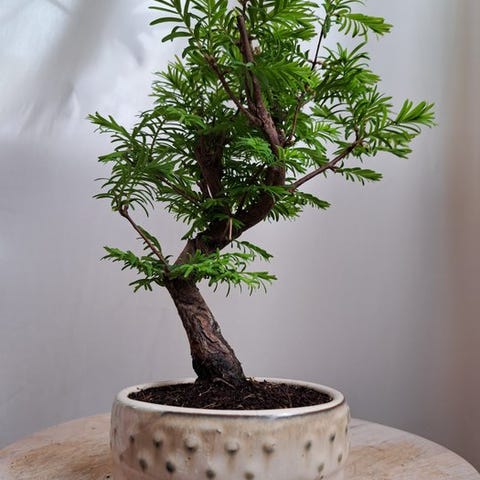 Smuk metasequoia-bonsai i en bonsai-skål. Godt rodfæstet og stærk bonsai, en bonsai som du vil få meget fornøjelse af. Træet er nemt at vedligeholde og derfor også velegnet for begyndende bonsai-entusiaster.