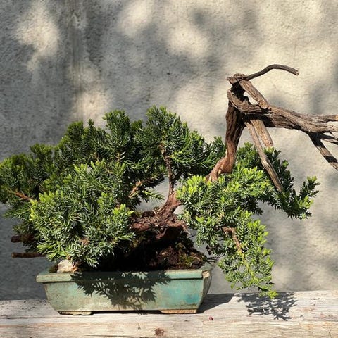 Til auktion er en elegant Juniperus Procumbens 'Nana' skabt ved hjælp af den raffinerede Tanuki (Phoenix Graft) teknik. Dette eksemplar udmærker sig ved sin yndefulde vertikale bevægelse og den kunstneriske integration mellem det levende træ og det sculpturale døde træ, der giver indtryk af en moden, vejrbidt bjerggran.