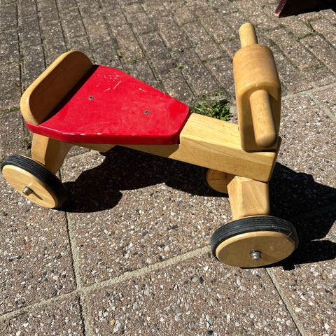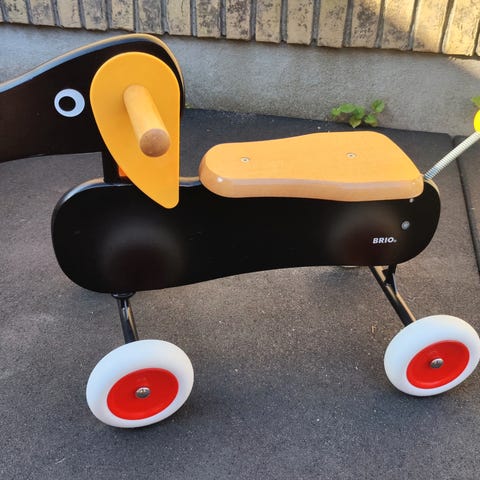 løbecykel udformet som en hund. Løbecyklen er i træ med fire hjul for stabilitet. Sædet er rødt, og stellet er primært hvidt med naturfarvede trædetaljer. Hjulene er i træ med gummikant. Styret er lige og i lyst træ. Velegnet som første løbecykel til små børn til indendørs brug på jævne underlag.