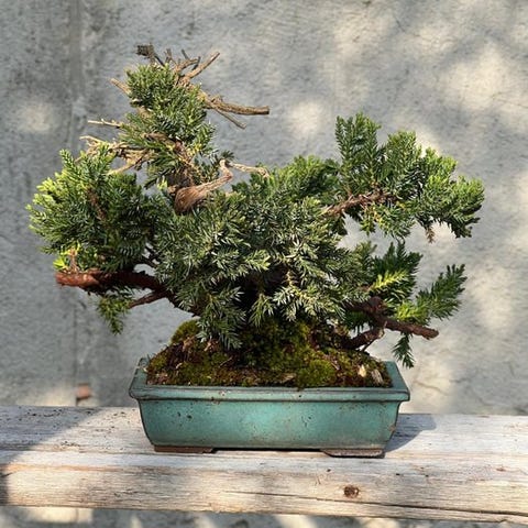 Juniperus Procumbens 'Nana', dværg japansk havefyrretræ Bonsai i Shohin-størrelse, med 38 cm krone, 15 cm træhøjde og 3 cm stamme, i en rektangulær mørkeblå glaseret potte (11 × 9 × 5 cm); udendørs stedsegrøn fra Japan. Klik på den blå "gå til varen" knap, for at købe eller byde på denne vare. Den samlede pris vil blive vist inden du afgiver dit bud.