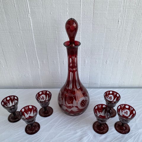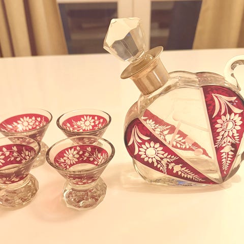 * Bøhmisk karaffel med sølvbelagte blomstermotiver + 2 små likørglas