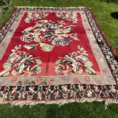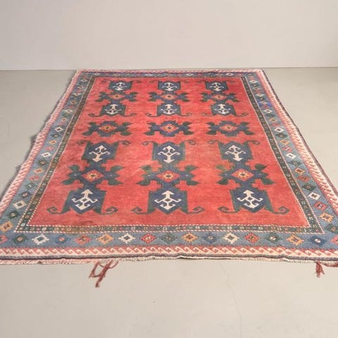 Condition: Brugt, med naturlig slitage og patina som følge af alder. Disse spor øger det autentiske karakter og historiske værdi af tæppet.