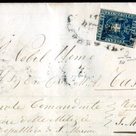 Brevet fra Rom til Tolentino, oprindeligt frankeret med 2 baj hvidgrønlig annulleret med dobbelt ring af Rom dateret 4. april 64. Frankeringen senere udbygget med en sjælden 3 baj "Brun lædermørk" variant af trykpladen "uden punkt efter 3" annulleret med gitteret. Samlet set meget sjældent og interessant. Meget frisk og af fremragende kvalitet. Signaturer Sorani og Raybaudi. Catalogus € 2000,00 for selve frankeringen, uden at tælle varianten endnu ikke censureret (anslag 2000 € tilsvarende lignende varianter) og udvidelsen af taksten. Et historisk post-historisk objekt meget særligt, som kan vurderes til mindst € 5000,00. Tidligere fra