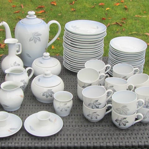 der er kaffestel til 14 personer og spisestel til 12 personer og mange løsdele