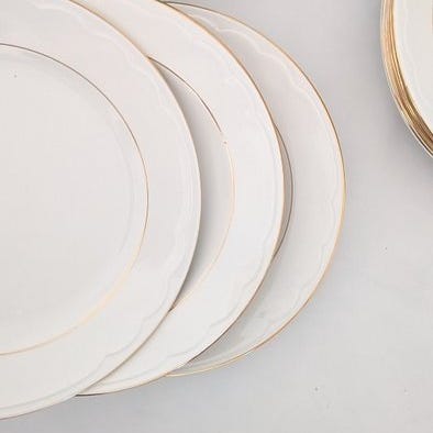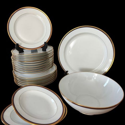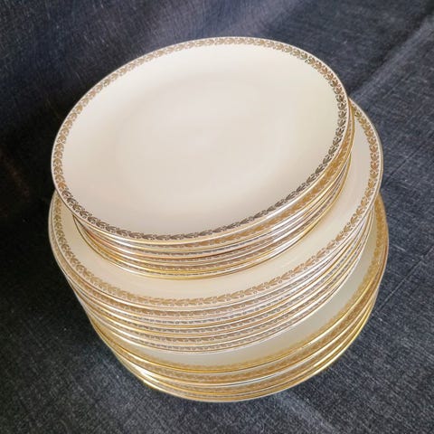Servicen er i fremragende stand, ingenbrud, guldkanten er stadig behageligt at nyde. At bemærke er craquelé, minimalt til stede på nogle tallerkener: sprækker, der er typiske for porcelænet fra S.C. Richard, i stærk keramik. Alle disse tegn skyldes alderen - servicen er over 70 år