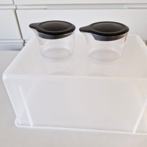 Tupperware opbevaringsbøtter på 1,5 liter i sort plast. Beholderne har firkantet låg og gennemsigtige sider, så indholdet kan ses. Egnet til opbevaring af tørvarer eller andre madvarer i køkkenet. Leveres som sæt med to stk.