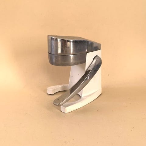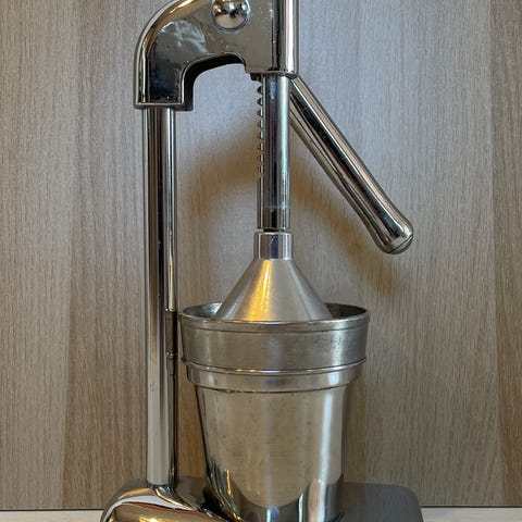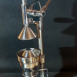 Stilfuld manuel citruspres/saftcentrifuge med et robust space-age-design og en høj-kvalitets forkromet metalfinish.