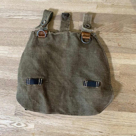 Militær rygsæk i kraftigt lærred i khaki/grønlig farve. Tasken har stort hovedrum med snørelukning foroven samt to frontlommer med klap og rem-/spændelukning. Justerbare skulderremme på bagsiden og flere remme og spænder til fastgørelse af udstyr. Velegnet som simpel frilufts- eller felt-rygsæk eller som samler- og rekvisitgenstand.