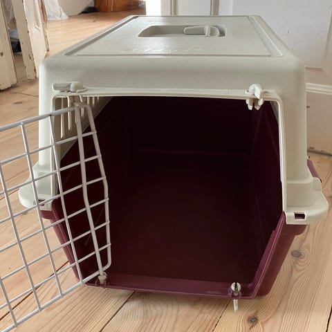 Transportkasse i plast til lille hund og voksne katte. Kassen er med praktisk håndtag og fødder, samt en plastdør, der kan åbnes på begge sider og tages helt ud. Boksen kan fastgøres i bilen med sikkerhedsselen takket være to specielle åbninger på toppen.