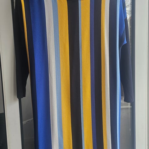 Elton hverdagskjole i viskose og elastan. Størrelde 44. Kjolen har et mønstret design med sort som grundfarve kombineret med hvid og grøn. Modellen har V-udskæring og 3/4-lange ærmer. Kjolen er 100 cm lang og brystmål 112 vm. Velegnet som hverdagskjole til kvinder, der ønsker en behagelig og let kjole med mønster.