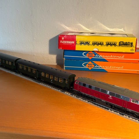 Fleischmann modeltog personvogne i rød/hvid bemaling. Sættet omfatter vogne med modelnumrene 5182, 5183, 5184 og 5185, som fremgår af æskerne. Vognene leveres i originale plastæsker med indlæg. Egnet til modeljernbaneanlæg, hvor der ønskes realistiske personvogne i skala tilpasset Fleischmanns sortiment.