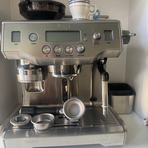 Sage espressomaskine i rustfrit stål med indbygget kværn. Maskinen har frontbetjente knapper, trykmåler, aftagelig drypbakke og damparm til opskumning af mælk. Egnet til brygning af espresso og andre kaffedrikke i hjemmet. Portafilter og bryggeenhed er placeret frontalt for nem betjening.