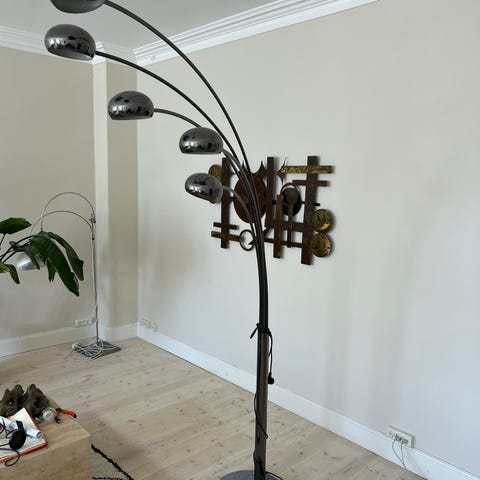 Super flot gulvlampe. Armene (de sølvfarvede) kan drejes lidt og de kobberfarvede skåle kan vendes, så lyset kan justeres i den retning du ønsker.