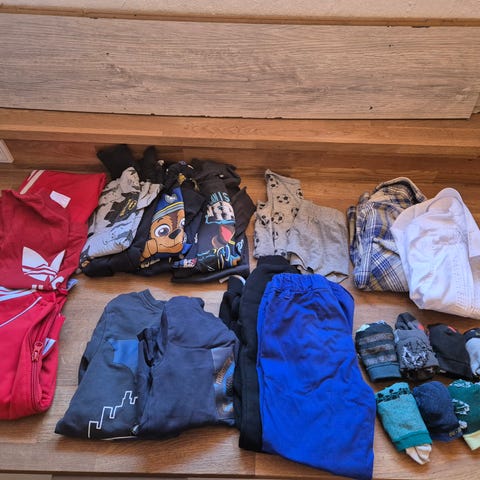 Tøjpakke str 104: 1 sæt adidias træningstøj (bukser, t-shirt og trøje), 3 sæt nattøj (Batman/Lego og paw patrol/nameit), 1 sæt undertøj (Nameit), 1 sweatshirt (Batbilerne/nameit), 1 langærmet t-shirt (monstertruck), 2 pak bukser sweat og chinos/name it og H&M, 2 skjorter / H&M. 10 par sokker / lego og adidas. 1 stk. Vest med marvel figurer, 1 stk. Bomber jakke, 1 stk. Fleecetrøje. Så godt som nyt, men brugt. Fra hjem uden dyr og røg. Vasket uden parfume. Sælges kun samlet.