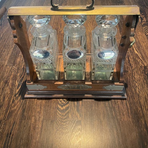 Tantalus, alder ukendt, formodentlig antik, god stand, 2 karafler har lidt afslag på krave