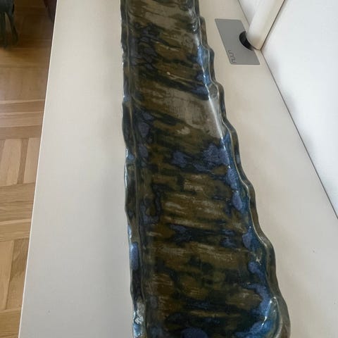 Keramisk håndlavet fad i blå og grønne nuancer sælges. Dimensioner 70 cm x 10 cm.