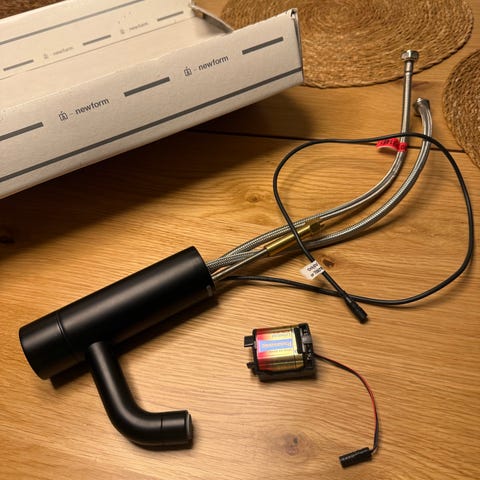 Blandingsbatteri vandhane i sort finish. Moderne, firkantet base med buet tud og etgrebsbetjening til regulering af vandmængde og temperatur. Leveres med monteringsdele som vist på billederne, herunder pakninger og gennemføringsdel i messing. Velegnet til montering på bordplade eller håndvask i badeværelse eller køkken, afhængigt af mål og eksisterende installationer. Nyt, sælges for kun 250kr, kan også sendes med posten for +50kr