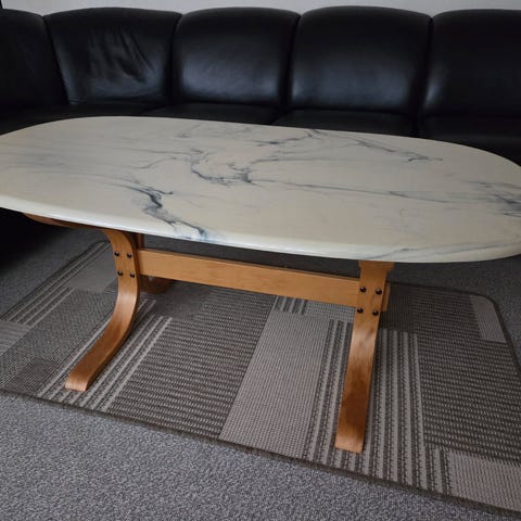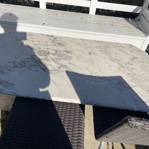 En solid og dekorativ bordplade, der har været brugt både som sofabord og spisebord – og de seneste år som stemningsfuldt spisebord på terrassen.