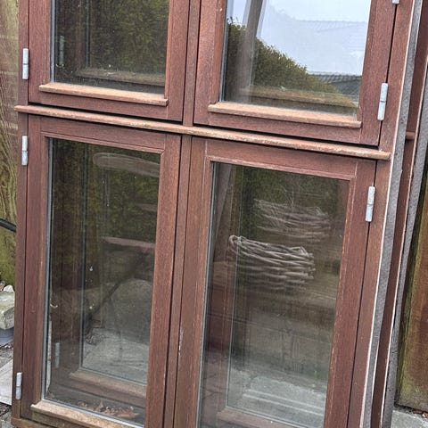 Trævinduer af kernetræ med enkeltlagsglas i hvidmalet ramme. Vinduerne er smalle og høje.