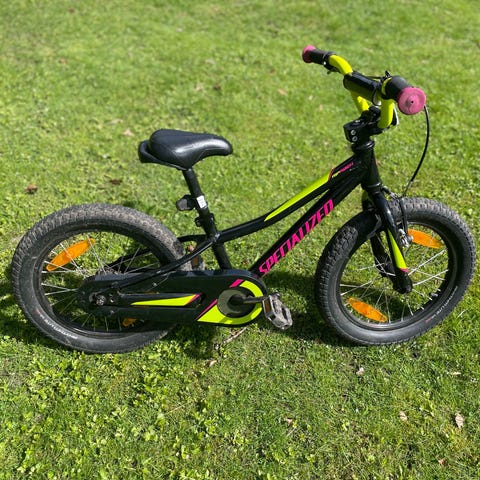Specialized børnecykel med 16" hjul. Cyklen har stel i grøn farve med blå og sorte detaljer. Udstyret med bagagebærer, støtteben, skærme, ringeklokke og reflekser. Egnet som børnecykel til hverdag og fritidskørsel. Manual til cyklen medfølger ifølge billederne.