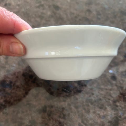 Hvidt porcelæn med gråt blomstermønster på ydersiden. Skålen har en enkel, rund form med lille fodring og en tynd kantmarkering langs overkanten. Undersiden er mærket med Bing & Grøndahl stempel og “Made in Denmark”. Velegnet som serveringsskål til fx salat, frugt eller til borddækning sammen med andet porcelæn i lignende stil.