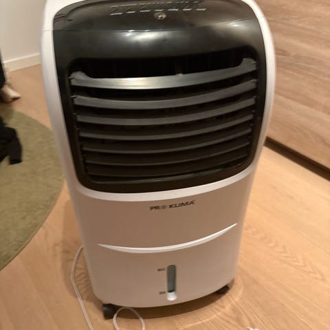 Conzept luftkøler i hvid. Enheden har kontrolpanel på toppen og gitter foran til luftudblæsning. Den står på hjul, hvilket gør den nem at flytte rundt. Der ses vandbeholder i bunden til kølefunktionen. Velegnet til indendørs brug til at give køligere luft i rummet.