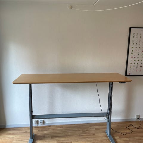 Elektrisk hæve sænkebord skrivebord med lys træfarvet bordplade og gråt metalstel. Bordet har rektangulær bordplade og to søjleben med T-fod. Under bordpladen er der monteret kabelbakke og betjeningspanel til højdejustering. Medfølgende strømforsyning og kabler ses på billederne. Velegnet som arbejdsbord eller kontorbord, hvor der er behov for justerbar arbejdshøjde.