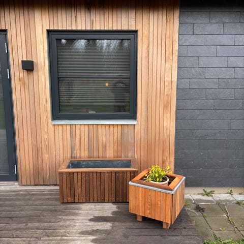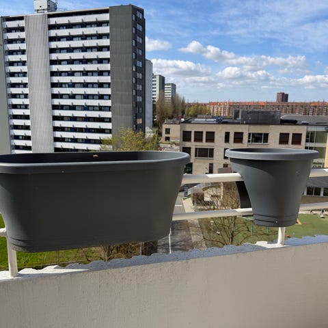 Altan plantekasse i metal i grøn nuance. Af lang, oval form med fast hank i midten, så den er nem at flytte rundt på altan eller terrasse. Egnet til udendørs brug. 35 cm lang, 14,5 cm bred og 26 cm høj. Kan hentes i Valby.