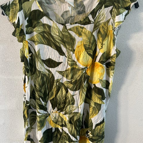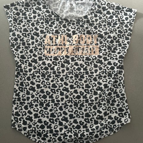 H&M T-shirt til dame i str. S. T-shirten er fremstillet i polyester og har et multifarvet leopardmønster. Modellen har korte, løse ærmer og rund hals. Passer til hverdagsbrug og kan kombineres med både jeans, nederdel eller shorts.